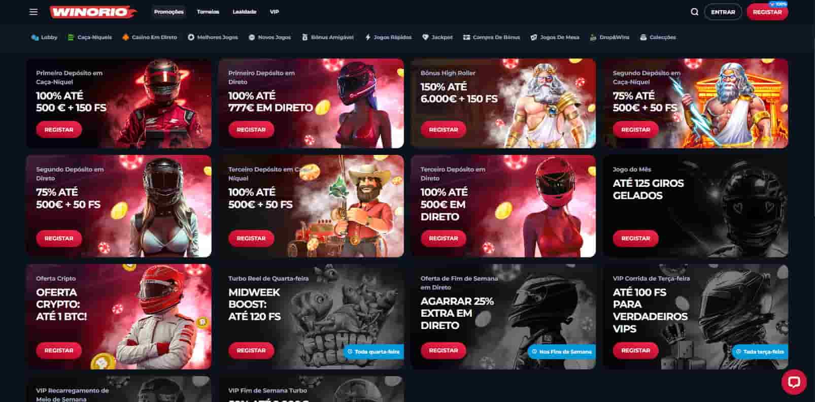 O casino online Winorio descreve um pacote de boas-vindas com alternativas para slots e jogos ao vivo. No primeiro depósito, existe um bónus de slots de 100% até 777 € com 100 rodadas grátis e depósito mínimo de 20 €, e uma alternativa ao vivo de 100% até 777 € com requisito de aposta aplicado à categoria ao vivo.