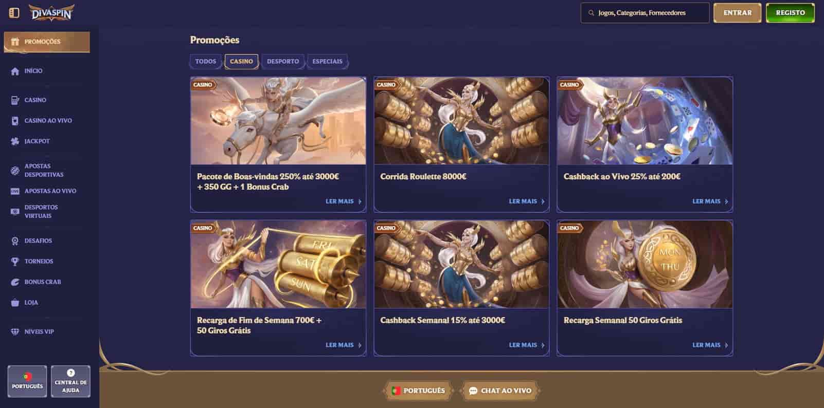 O interesse principal da app está em três áreas: promoções, jogos e caixa. Em informação divulgada publicamente sobre a marca, aparece um pacote de boas-vindas anunciado como 250 por cento até 3000 euros com 350 free spins; ainda assim, as condições podem mudar por país e por calendário de campanhas. Se o objetivo é Diva Spin casino a dinheiro real, importa ler o rollover, os prazos e os jogos elegíveis antes de ativar qualquer bónus.