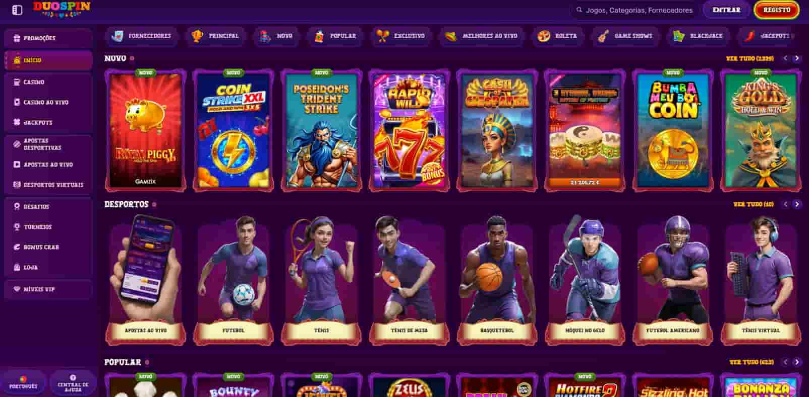 O catálogo reúne milhares de títulos e filtros úteis, o que ajuda no ecrã pequeno. No aplicativo do DuoSpin no telemóvel, a pesquisa por nome e a lista de favoritos aceleram a escolha. Entre os estúdios, aparecem nomes populares como Pragmatic, Playtech, Novomatic, Playson, Relax Gaming e Spribe, com slots, jogos instantâneos e mesas.