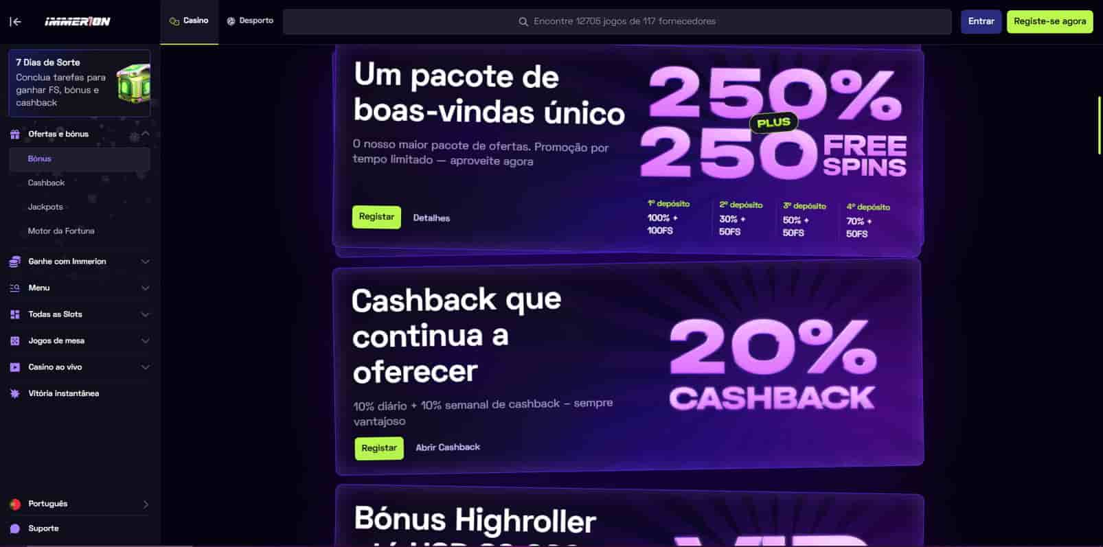 Os bónus são uma parte central para novos utilizadores e também para quem joga com frequência. No Immerion, o destaque costuma ir para o pacote de boas vindas por depósitos, com percentagens e rodadas grátis associadas. Pode existir mais do que uma opção de entrada, por exemplo um caminho para depósitos mais altos e outro mais acessível, mas as condições variam por campanha.